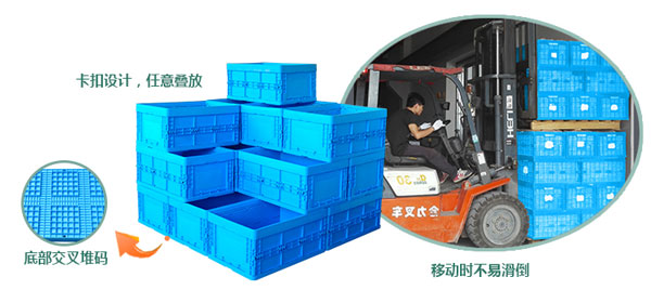 5、防滑放倒:箱子底部交叉堆碼,卡扣設(shè)計(jì),任意疊放,防止箱子在移動時(shí)因堆高而易滑倒