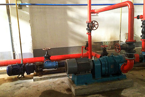 如圖所示,我們的凸輪轉(zhuǎn)子泵替代了原來的單螺桿泵,圖上為一臺單螺桿泵和凸輪轉(zhuǎn)子泵,可以看到介質(zhì)流經(jīng)這兩臺泵腔內(nèi)的行程是完全不同的,凸輪泵很短,也是取代原有螺桿泵的主要原因,目前單螺桿泵做為備用泵!